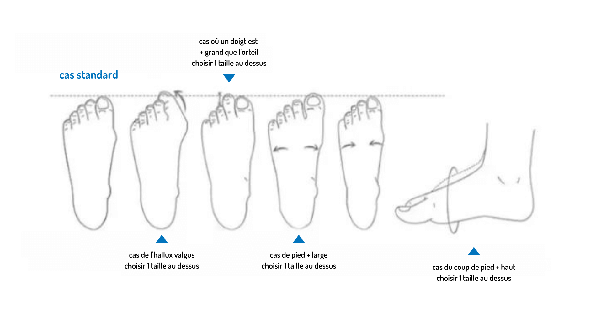 (hallux valgus, pied large, doigt de pied plus long que l'orteil, coup de pied plus haut...)